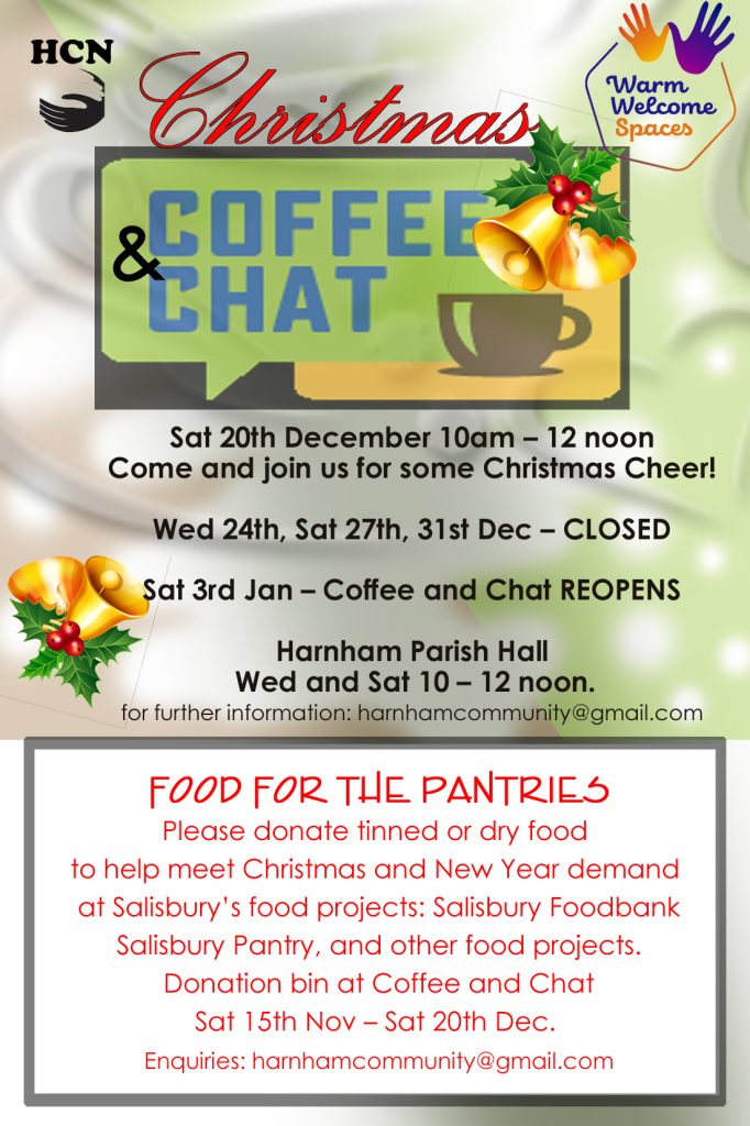 Christmas 2025 arrangements: Christmas Cheer (mince pies etc) on Saturday 20 December, then Coffee and Chat will be closed on Wed 24, Sat 27 and Wed 31 December. It will reopen on Saturday 3 January 2026 to celebrate the New Year.